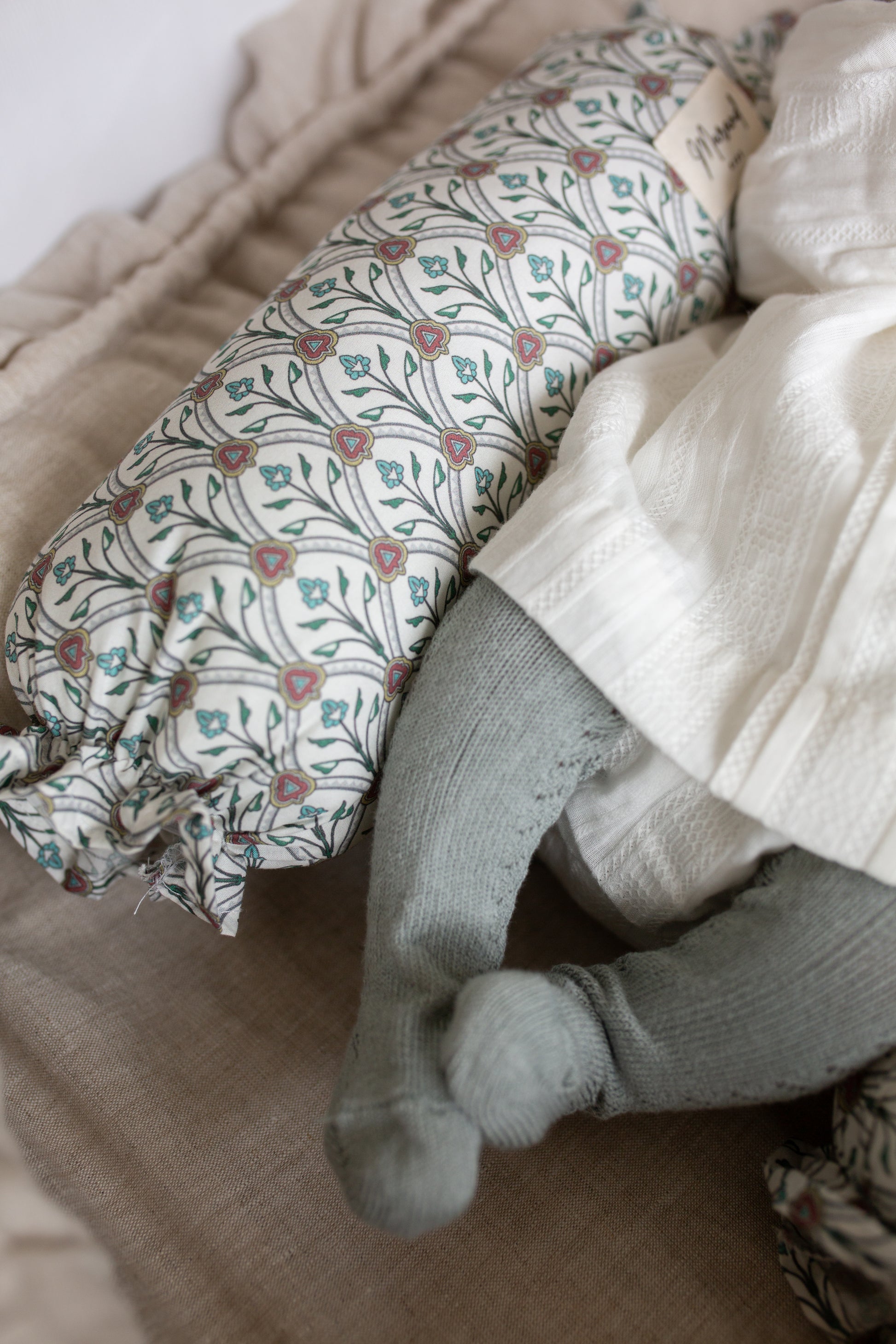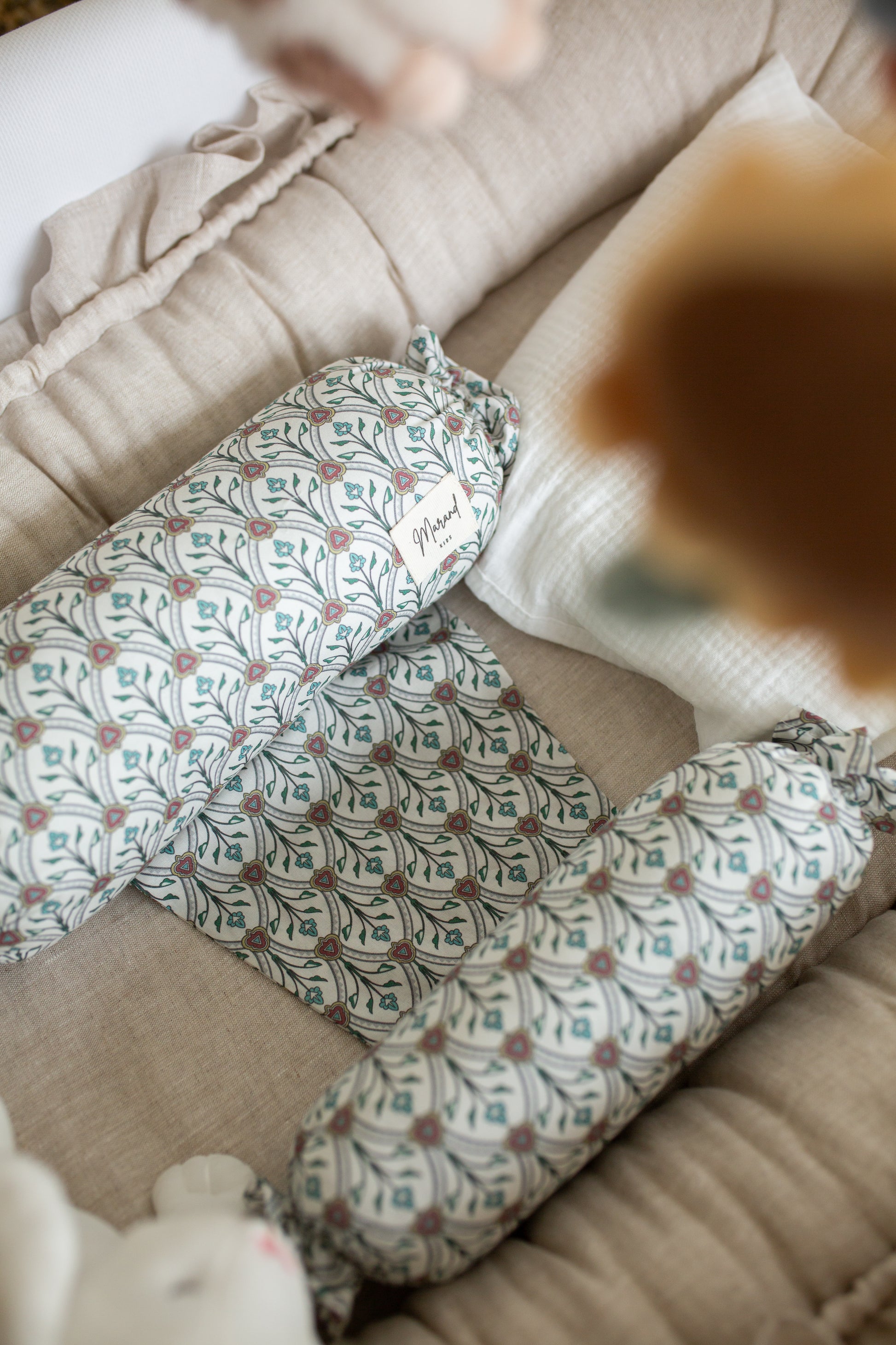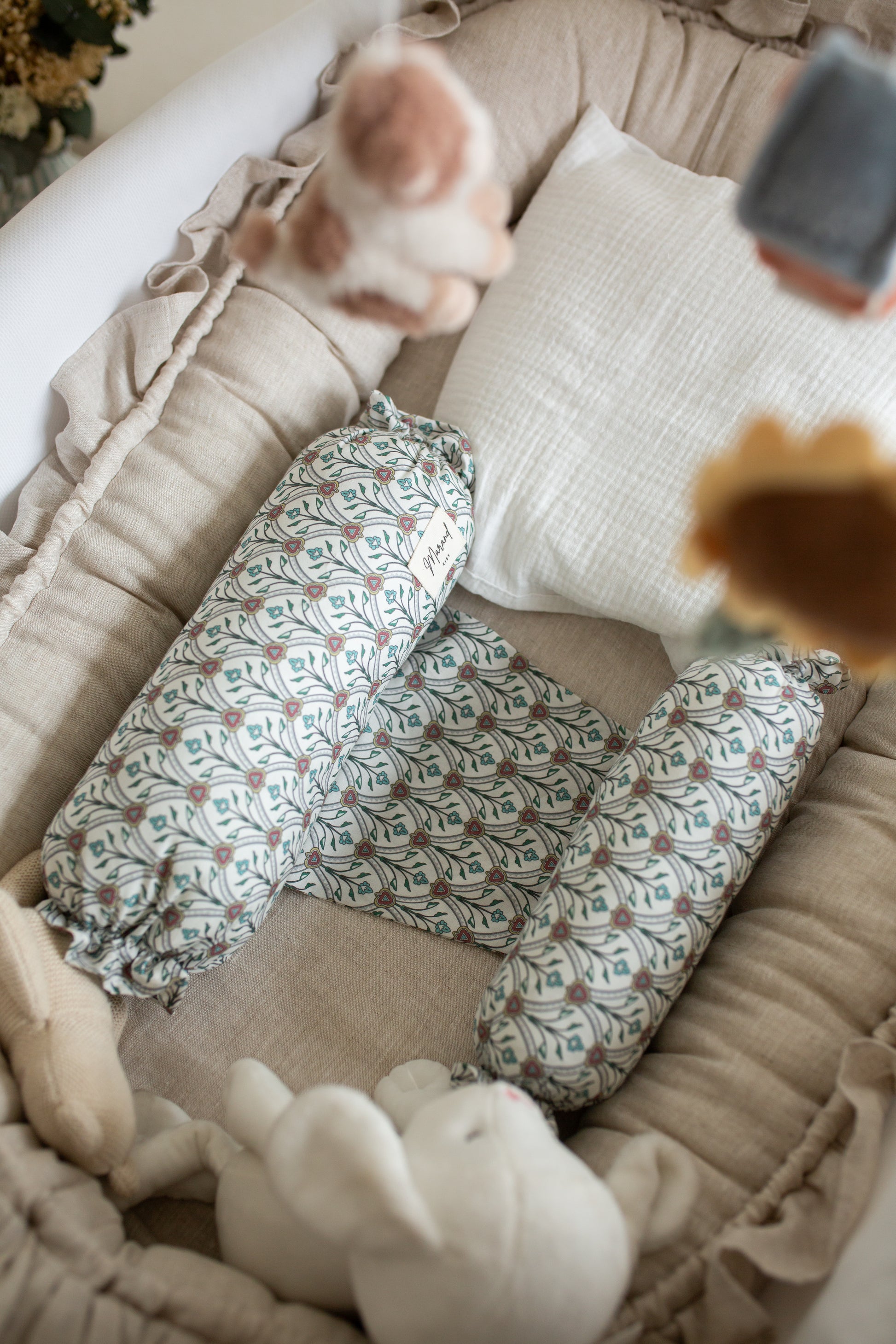 Nuestros rulitos antivuelco permiten que el bebé se sienta arropado en todo momento. Son dos cojines suaves y acolchados ligados por una suave tela de algodón donde acostamos al bebé evitando así que se voltee.